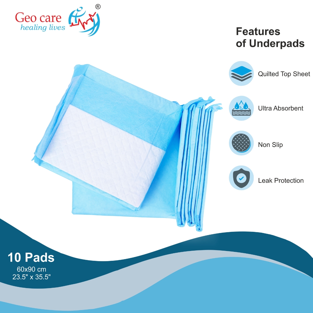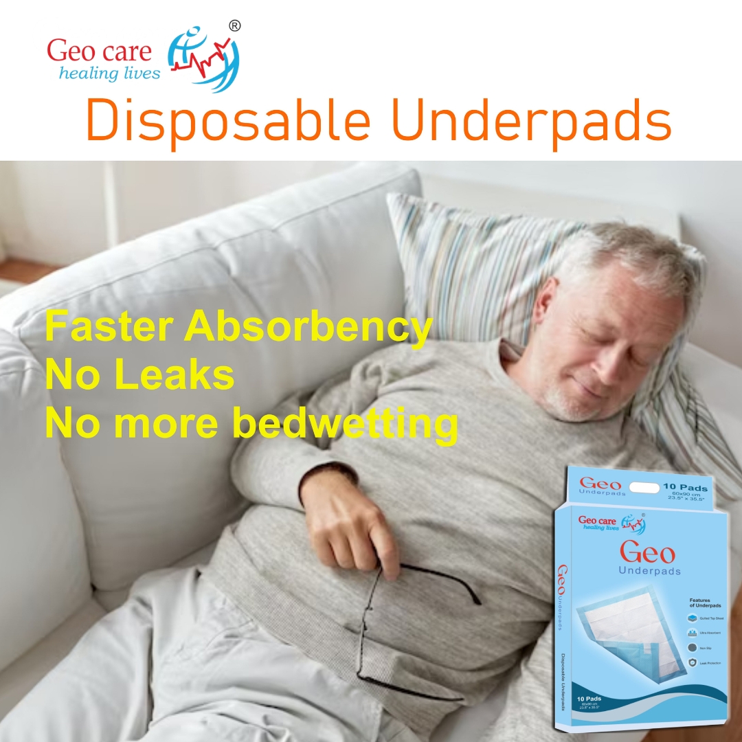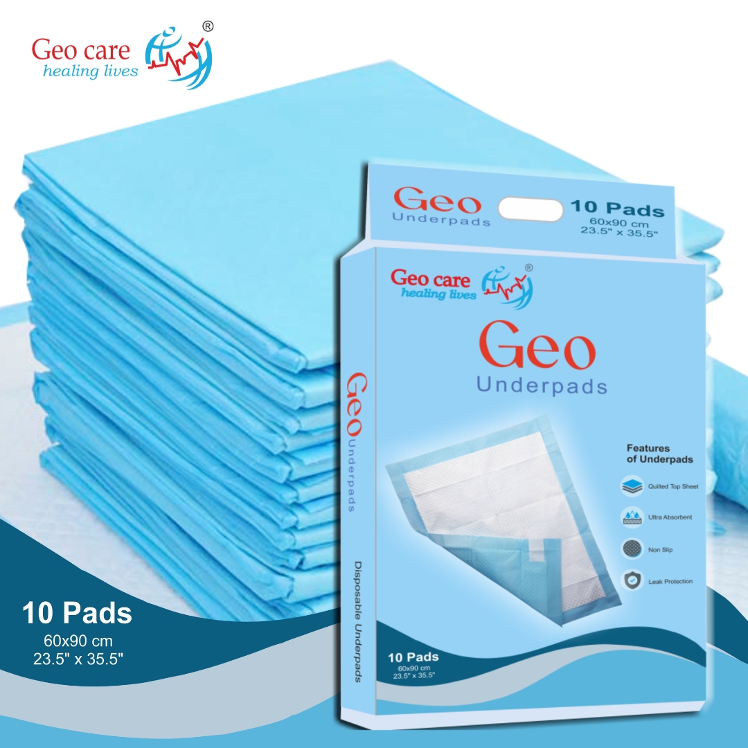 Geocare Underpads are absorbent sheets designed to protect beds, chairs, or other surfaces from leaks and spills. They provide comfort, hygiene, and reliable protection for patients, seniors, and daily use.